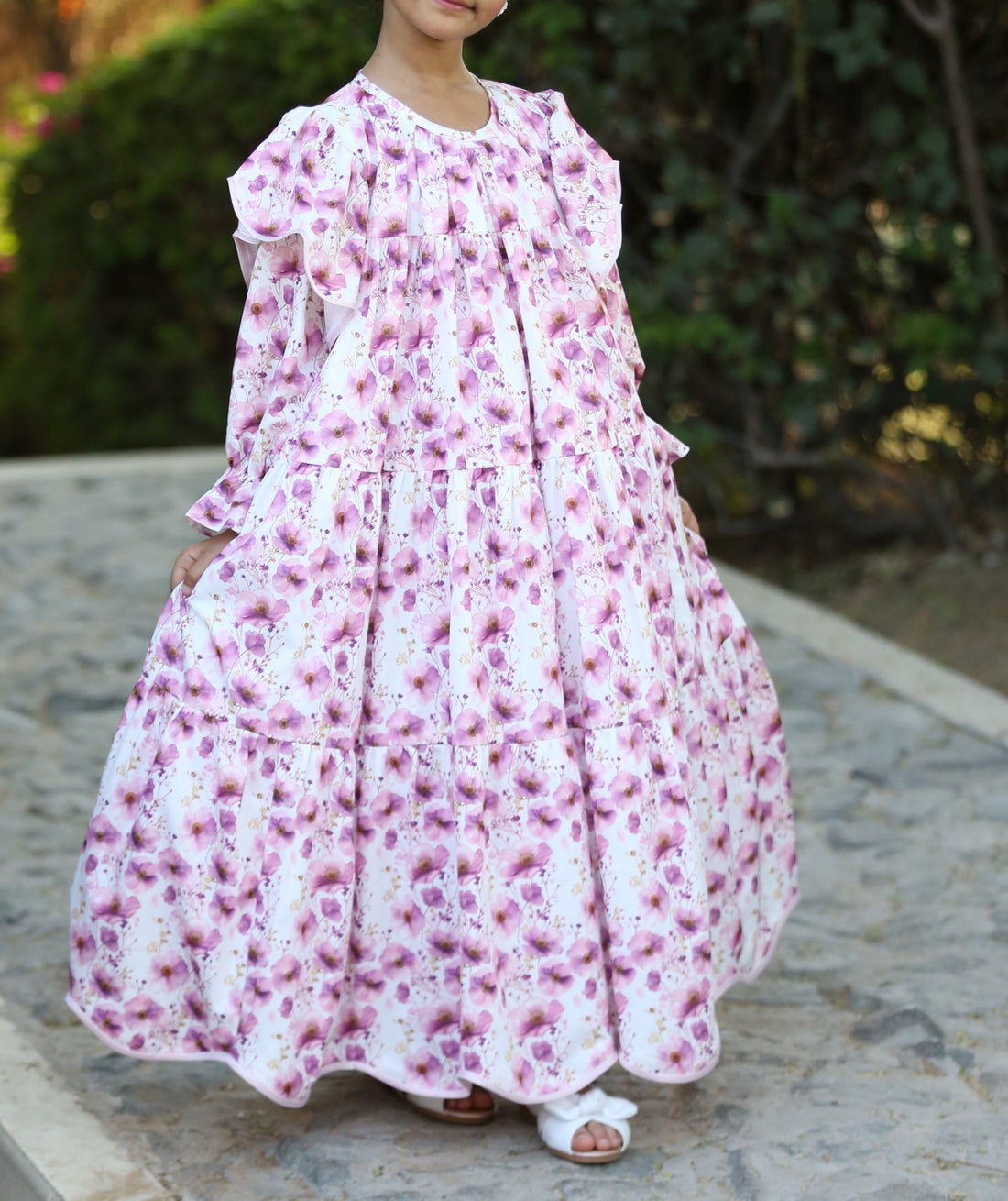 Soft blush florals bloom across flowing tiered layers, creating a dreamy silhouette perfect for garden...