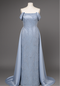 Step into timeless elegance with the Azure Grace Gown, a stunning masterpiece crafted in delicate light blue satin and adorned with intricate hand-beaded detailing. The graceful off-shoulder drape enhances femininity, while the slim, tailored silhouette flatters the figure with a regal touch. Designed with exquisite beadwork that shimmers with every movement, this gown is the epitome of sophistication perfect for evening occasions, weddings, or special celebrations.
