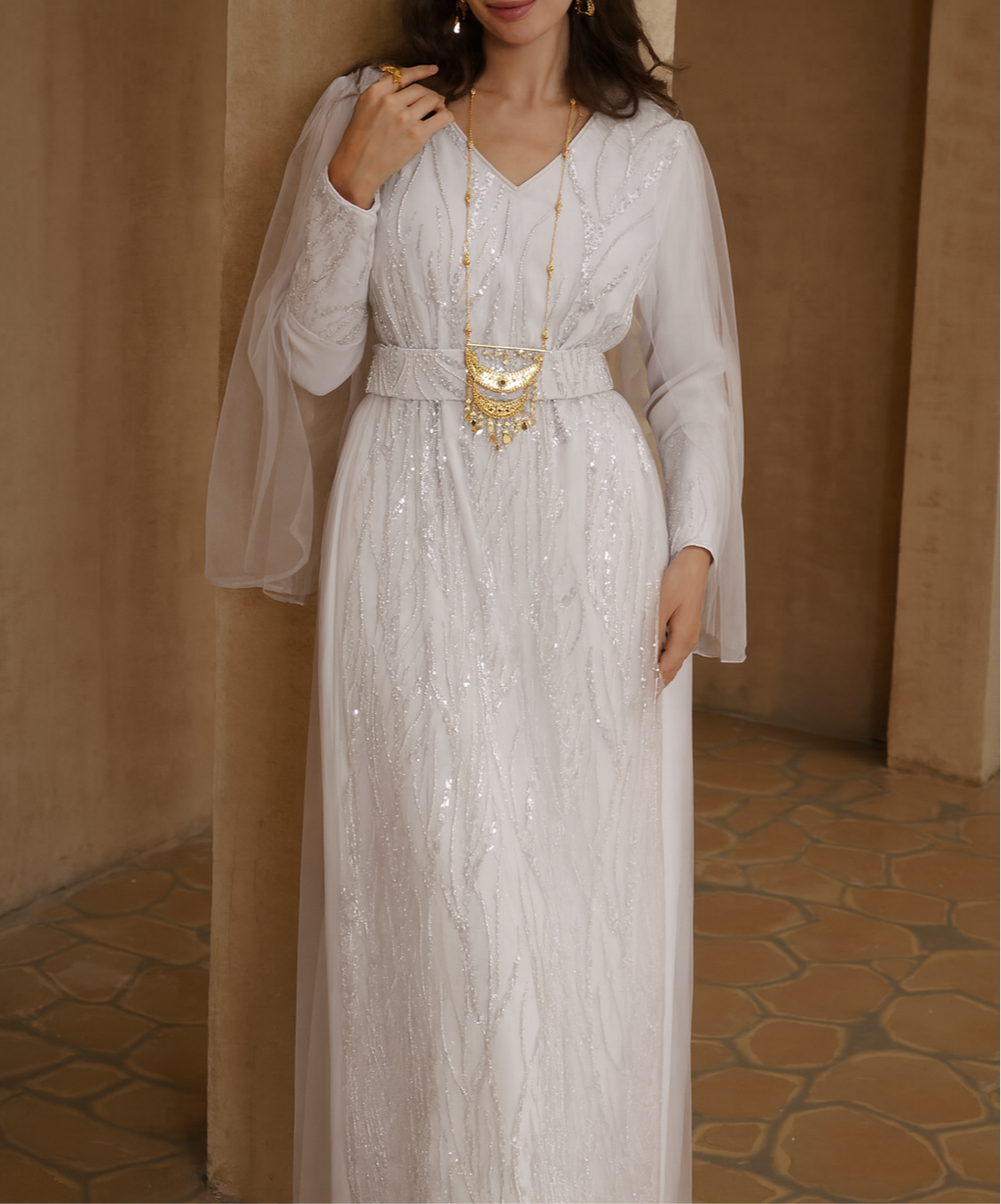 Gracefully tailored from soft crepe fabric & in top attached with toor, this white Jalabiya combines comfort with sophistication. The design features shimmering embellishments along the neckline and sleeves, adding a subtle touch of glamour. Perfect for special occasions and elegant gatherings.