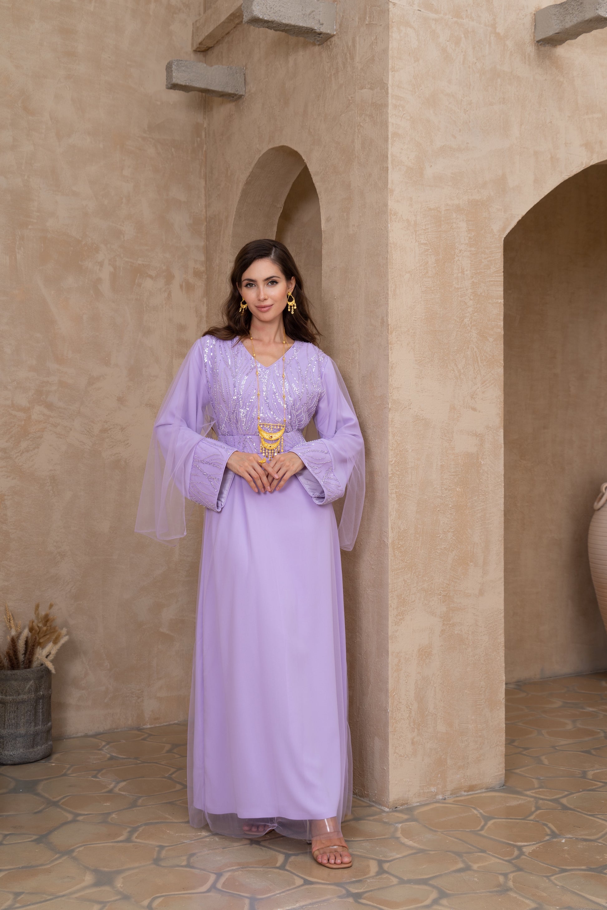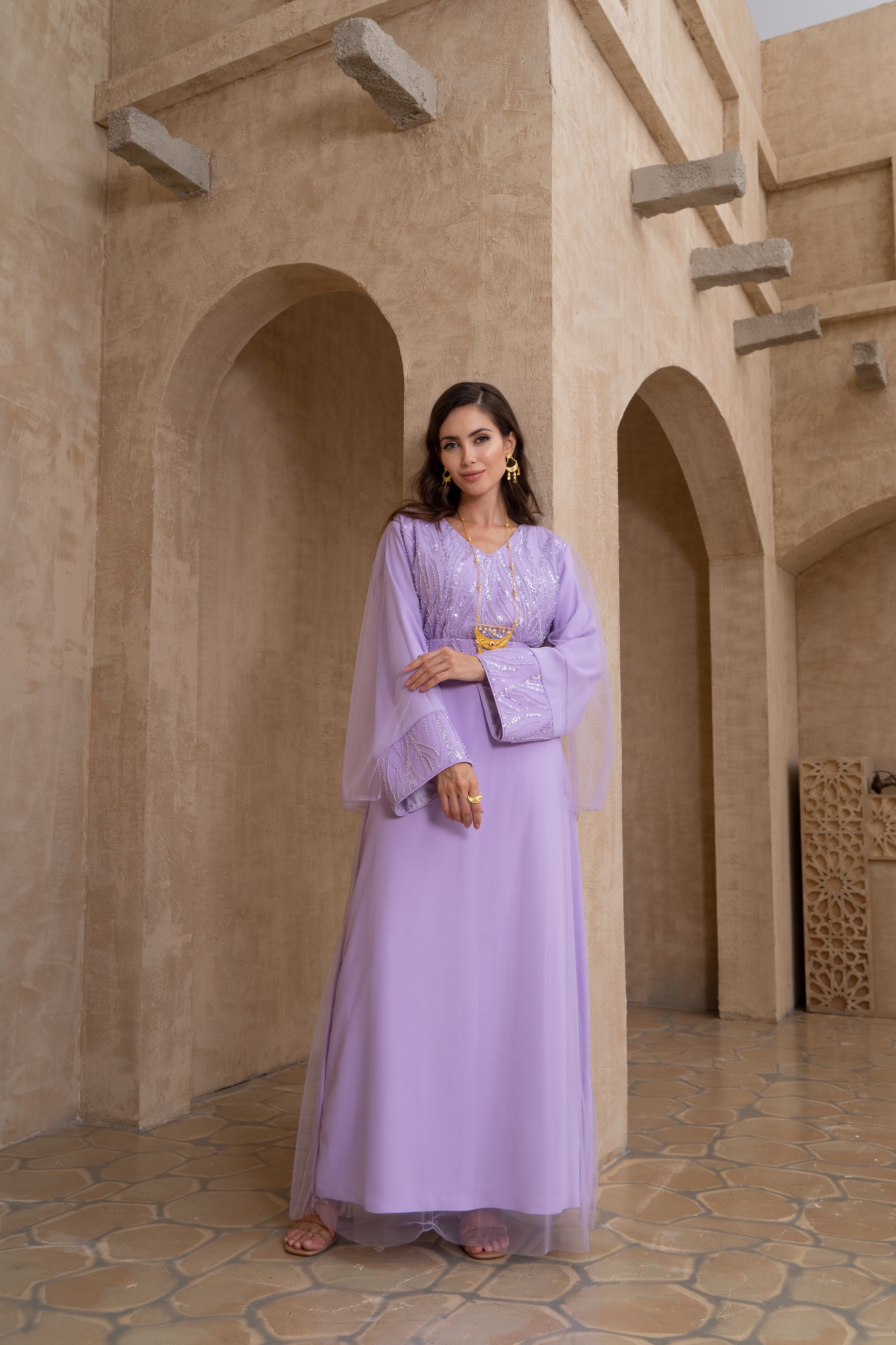 Gracefully tailored from soft crepe fabric & in top attached with toor, this lavender Jalabiya combines comfort with sophistication. The design features shimmering embellishments along the neckline and sleeves, adding a subtle touch of glamour. Perfect for special occasions and elegant gatherings.