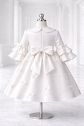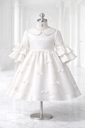 A timeless ivory satin dress designed for the most elegant little moments. Featuring a delicate Peter Pan collar, layered ruffle sleeves, and hand-placed satin bows throughout the skirt, this piece is the perfect blend of classic charm and modern couture. Finished with a statement bow at the back for a truly graceful look.