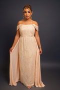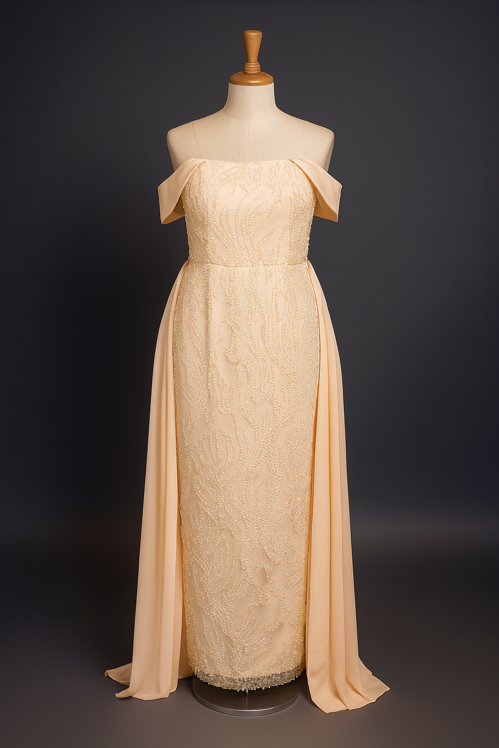 فستان بلمسة الشامبين الملكي يعكس الأناقة الهادئة والفخامة الراقية بتصميمه الانسيابي ولونه الذهبي الفاتح المستوحى من الشامبين. يتميز بقصة الكتف المكشوفة التي تُبرز جمال الإطلالة، مع تطريزات دقيقة من الخرز الناعم تضيف لمسة فاخرة تنطق بالأنوثة والرقي. يمتد القماش بخفة وانسيابية ليمنح الفستان حضورًا ملكيًا يناسب المناسبات الراقية والسهرات الخاصة
