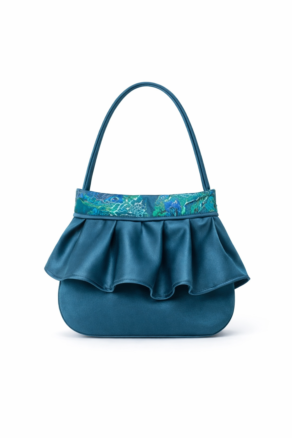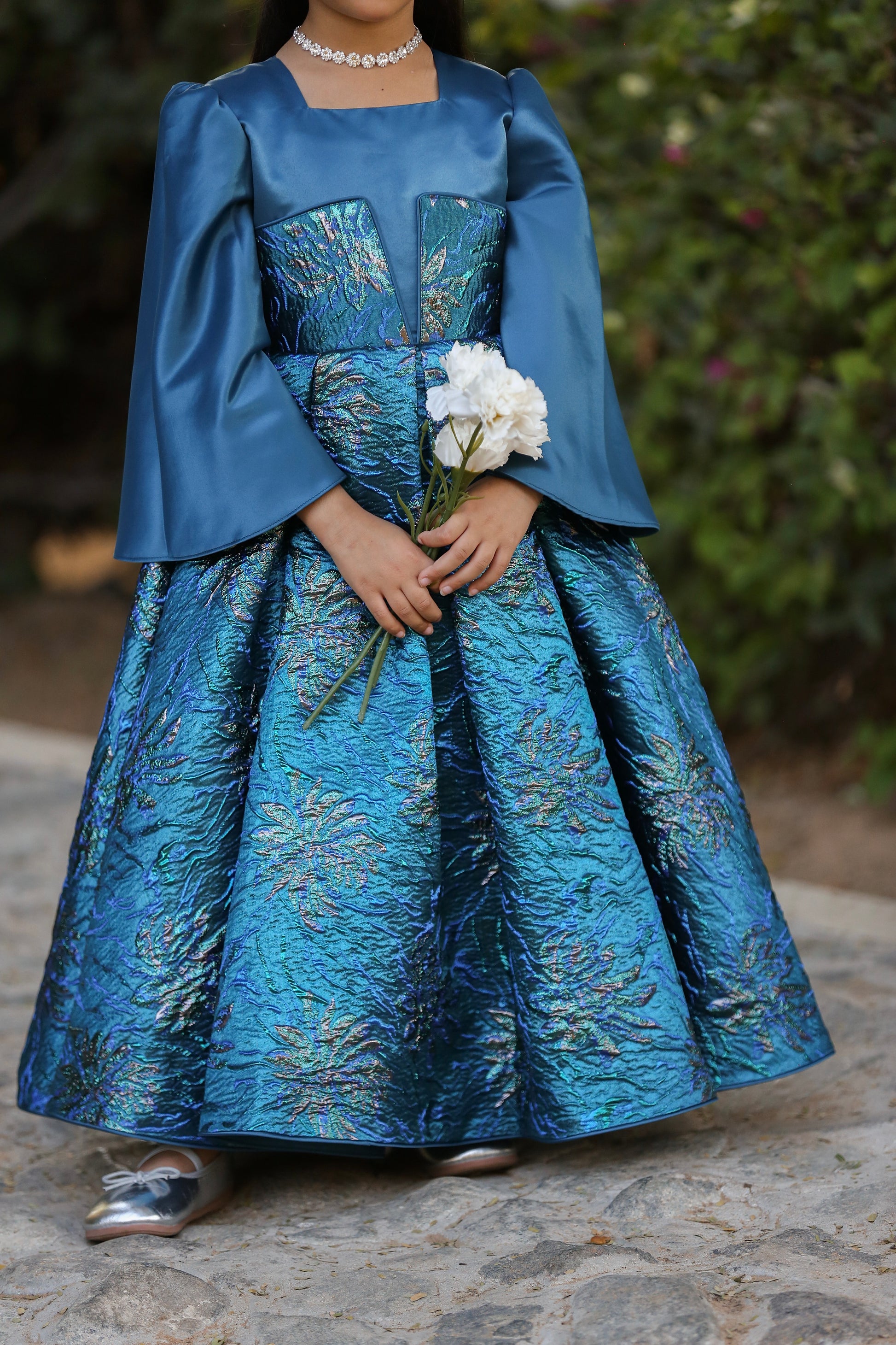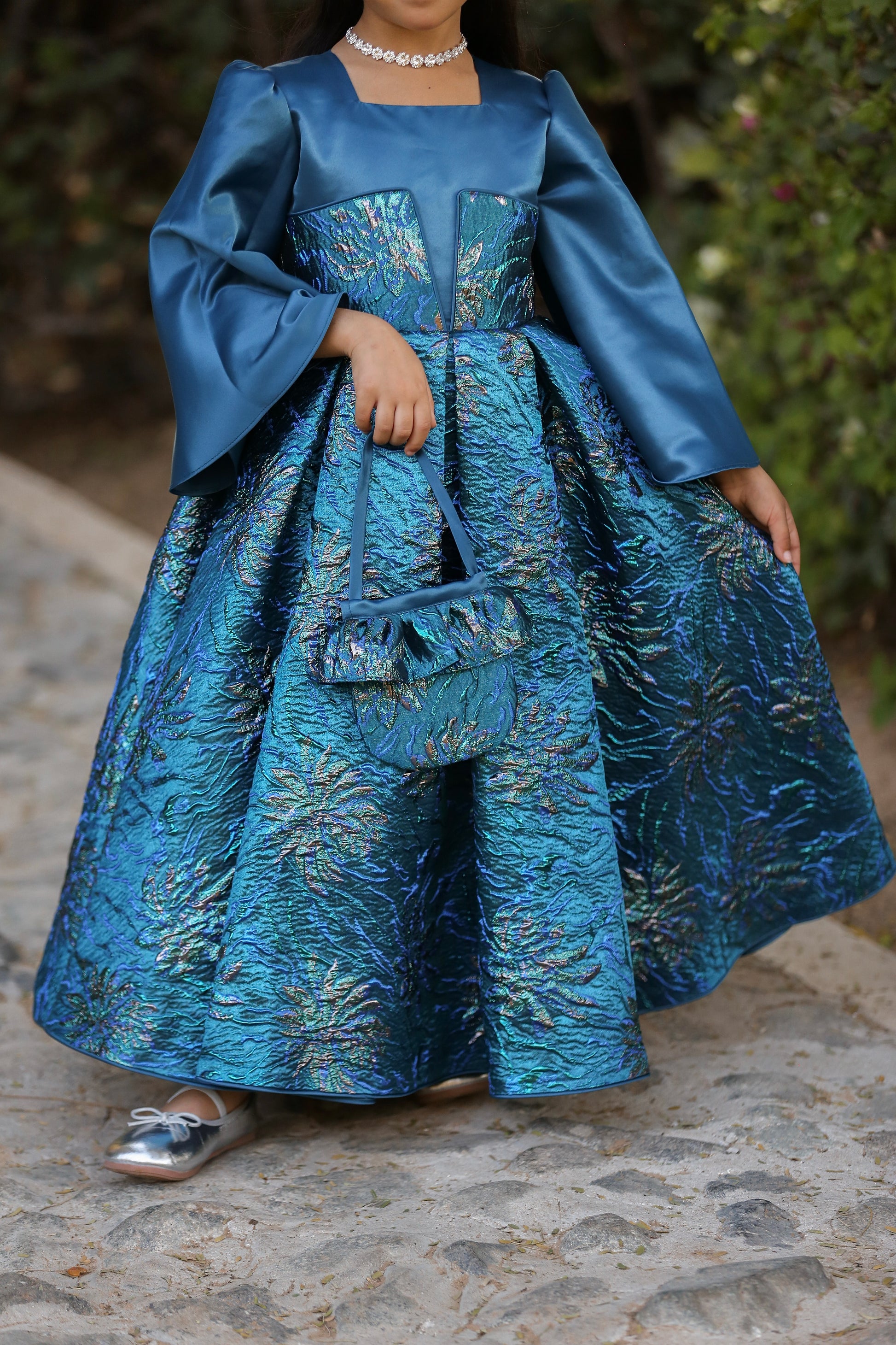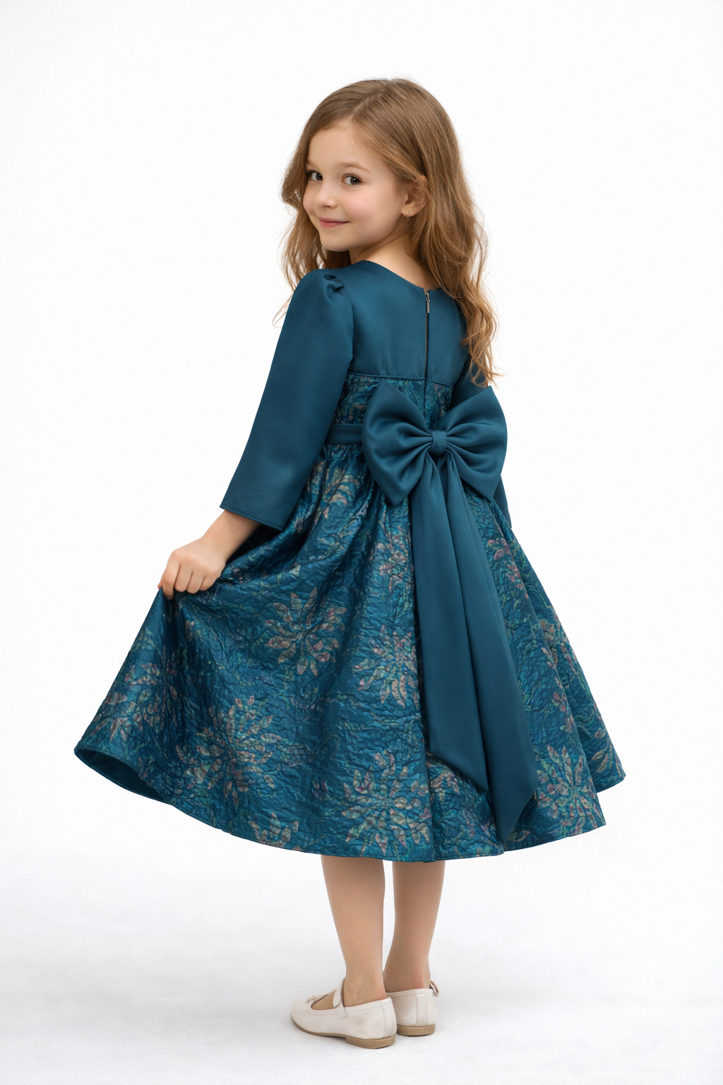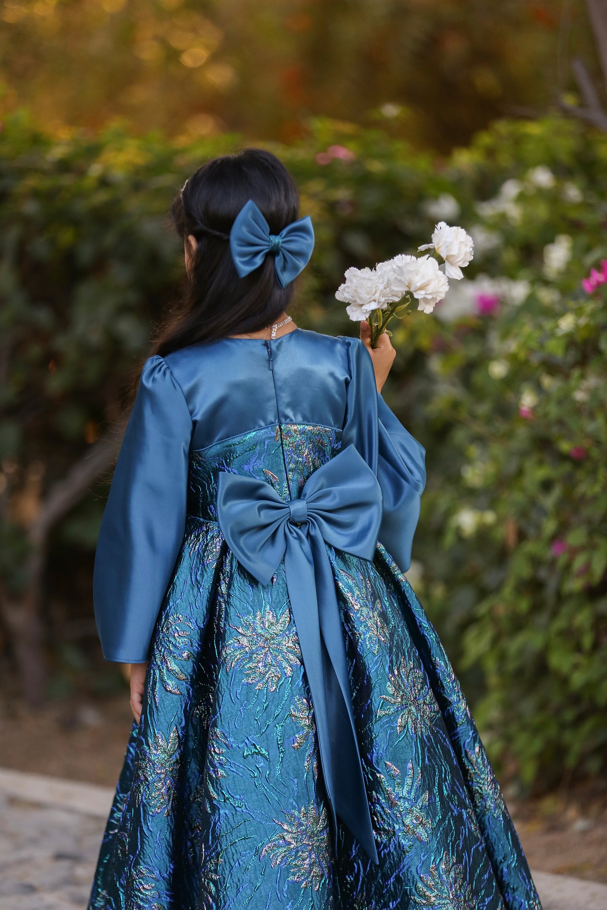A statement party dress in deep teal satin with a rich floral jacquard skirt. Features a structured square neckline, elegant long sleeves, a full pleated skirt for maximum volume, and a signature oversized back bow. Finished with a hidden back zipper for a clean, polished look